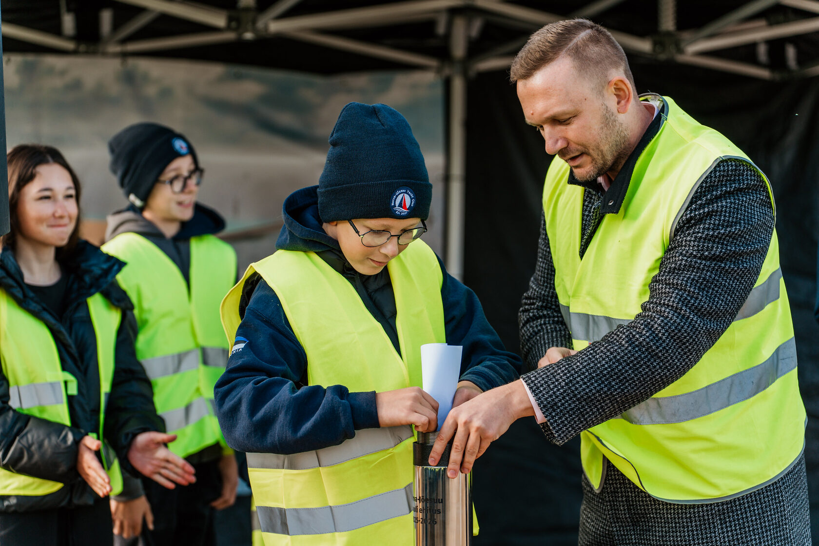 Young members of the Narva-Jõesuu Yacht Club took part in the laying of the time capsule together with the mayor, symbolising continuity between generations and a shared focus on the future. Musical accompaniment for the ceremony was provided by musicians from the Popside brass band. After the official part of the event, participants had the opportunity to visit the construction site and learn more about the progress of the works, as well as to visit the Narva-Jõesuu lighthouse.