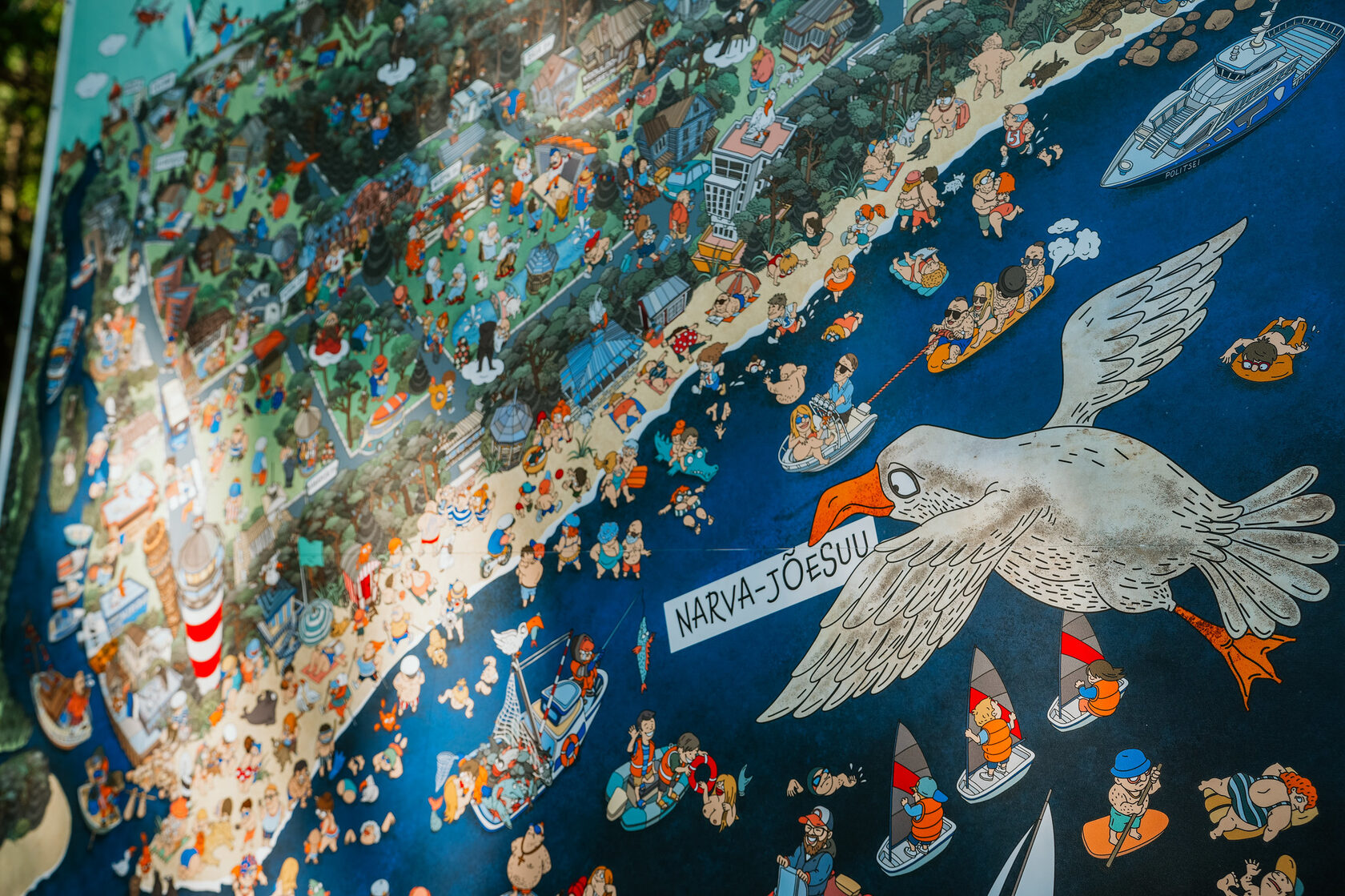 The illustrated map brings together Narva-Jõesuu’s key layers — the sea and sandy beach, pine forests, the lighthouse, historic architecture and everyday resort life. Together, they form a visual story that conveys the atmosphere of the townrather than a single moment in time. The map works as an invitation to dialogue: every viewer reads it in their own way, discovering details and meanings that resonate personally.
