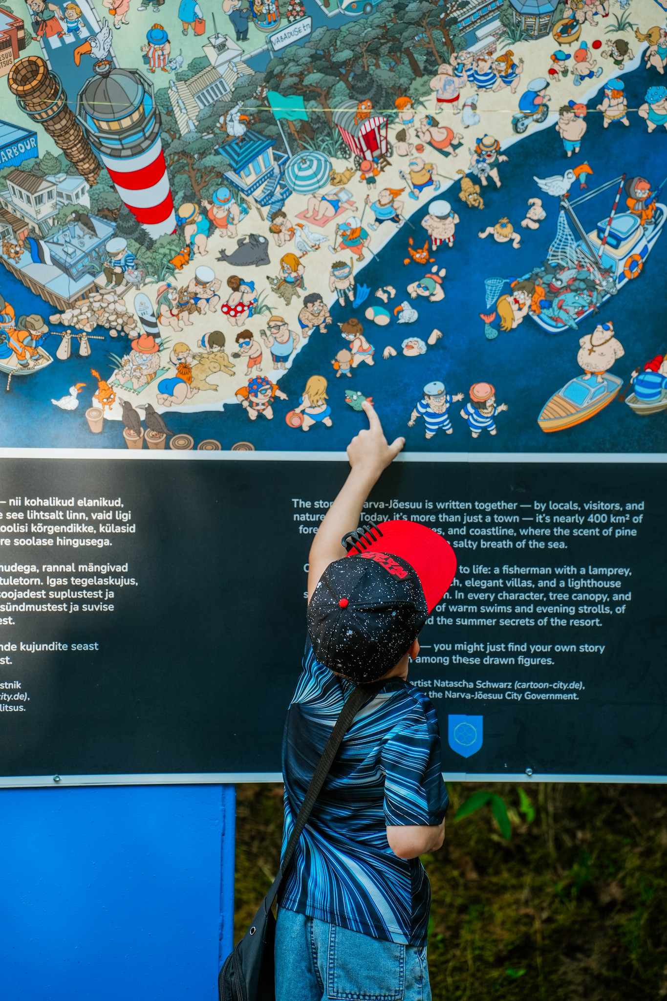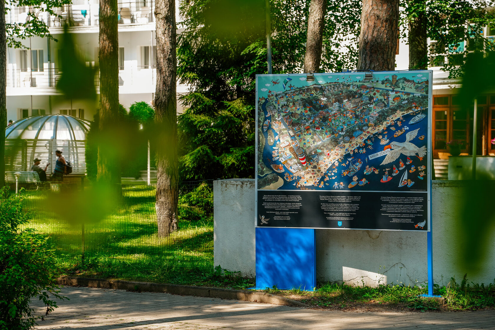 The illustrated map-poster is displayed on two outdoor information boards on Aia Street, one of Narva-Jõesuu’s most frequented promenade areas.
